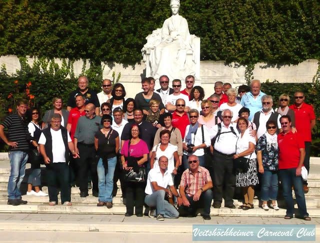 Sightseeing-Tour nach Wien Am Sonntag gab es erst eine Stadtrundfahrt mit dem Bus, ehe wir wieder in die City zur nächsten Besichtigungstour zu Fuß gebracht wurden. Neben dem Stephansdom, der Augustinerkirche (hier heiratete Sissi), der Hofburg und zahlreichen anderen Bauten besichtigten wir das „Sissi-Schloss“, was besonders bei den Damen sehr gut ankam. Nach all den tollen Eindrücken fuhren wir am Abend nach Neustift am Walde zum Heurigen. Im „Schreiberhaus“ wartete schon ein warmes Büffet in einer urgemütlichen Stube auf uns. Es wurde gefeiert, gelacht und gesungen. Der „Teufelsmusiker“ Erhard Sungl umrahmte musikalisch mit seinem Schifferklavier. Als Dank bekam er einen Orden, eine Mütze und ein T-Shirt von Udo verpasst. Die tolle Stimmung war so ansteckend, dass eine jugendliche Gruppe aus England von nebenan mit uns – obwohl sprachliche Barrieren vorhanden waren – „Sirtaki“ tanzten. Sie wollten uns gar nicht mehr gehen lassen. Fazit: Bei kaiserlichem Wetter mit sommerlichen Temperaturen in der wundervollen Kaiserstadt – was kann es schöneres geben. Und viel gelernt haben wir auch, nämlich: „dass Aufzug fahren doch nicht so einfach ist, dass Mistgabeln nicht nur zum Stall ausmisten geeignet sind, dass es in Österreich auch eine neue Schinkenart gibt...den Pa(h)la(h)t-Schinken, dass Alte noch hoch hinaus wollen, dass Turteltauben nicht immer weiblich sein müssen, dass es Duschköpfe mit LED-Leuchten gibt, dass man immer viel trinken muss, dass wir die Sissi-Trilogie nun an Weihnachten mit anderen Augen betrachten werden, dass man als Alter den „Jungen“ „Sirtaki tanzen“ beibringen kann und dass Soda-Flaschen auch für sog. Soda Games verwendet werden können“, so die Worte des Elferratssprechers am Ende der Fahrt. Vielen Dank an die beiden Organisatoren Peter Will und Udo Mohr, die wieder ein Superprogramm mit vielen Highlights bereithielten.